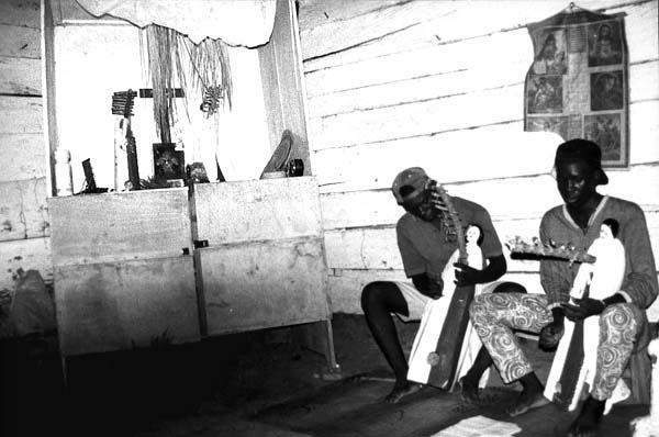 les joueurs de cithare accordent leur instrument (la petite cithare: Okambo Ngoma) dans la petite chambre réservée.