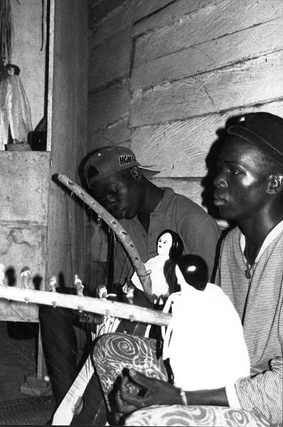 les joueurs de cithare accordent leur instrument (la petite cithare: Okambo Ngoma) dans la petite chambre réservée.