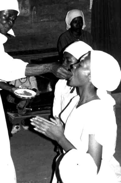 communion. Les gens sont à genoux, le Nganga met la racine dans la bouche.