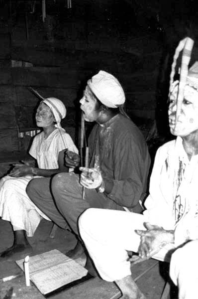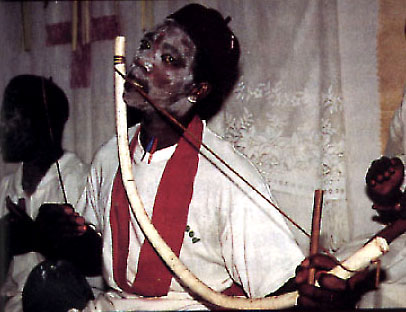 Le Be, ou Mbegn est l'instrument des origines, avant meme la naissance de l'oeuf. Les trois noeuds sur sa corde representent Nzame, sa soeur et son frere. C'est l'ouragan qui, en faisant vibrer sa corde a donne l'oeuf. Il joue seul pour la distribution de l'iboga, puis à des. |