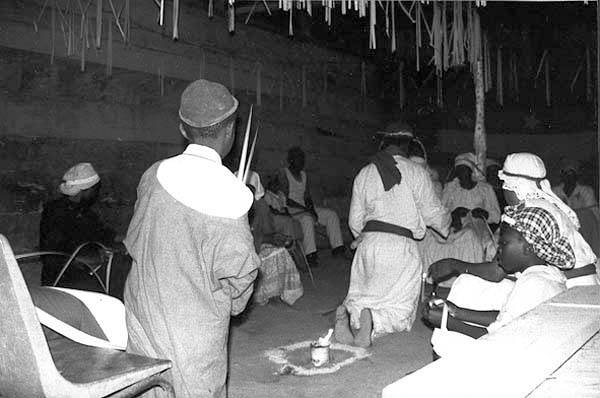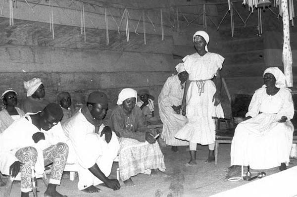 Le Nzimba ou Njimba designe a la fois le lieu de la reunion et la reunion elle meme. Au village le lieu de reunion des inities est a l'autre bout du village, dans l'axe du temple. Ici, en ville, la reunion a lieu dans le temple. C'est au cours de cette reunion que sont evoques tous les problemes du Ngose (organisation, offrandes, etc...). Sur cette photo on note, au pied de l'Acon (poteau central), la Kombo, proprietaire du temple et organisatrice du Ngoze'. A sa droite debout, la joueuse de Nzoe Ngoma et assis, les trois Nganga.